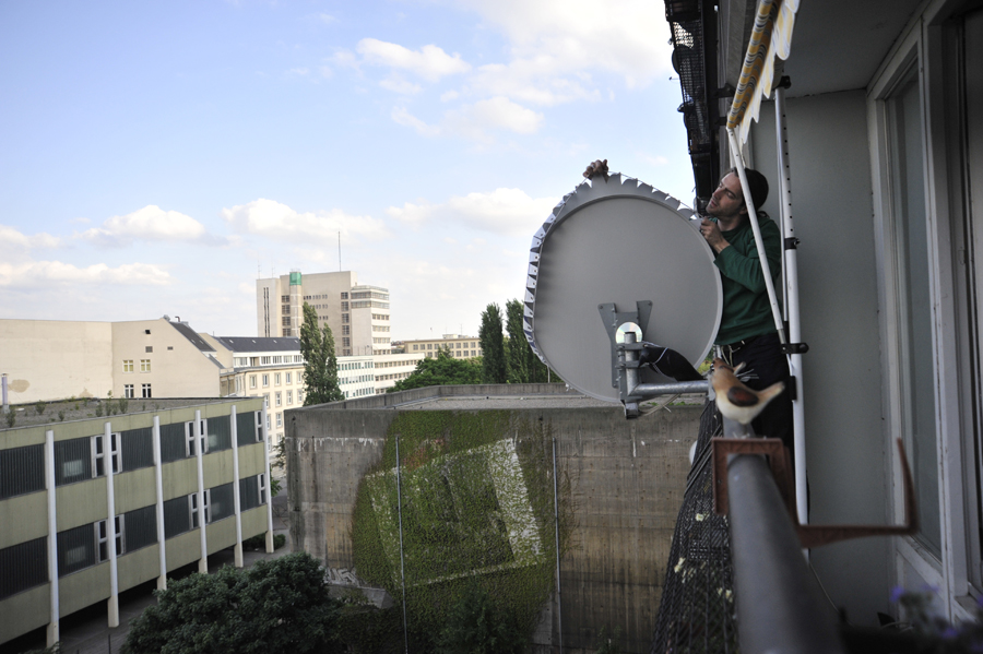 Für mich verkörpert diese Antenne auch ein starkes Symbol. Dieser Parabolspiegel schafft eine Verbindung zwischen dem gegenwärtigen Wohnort eines Menschen und seines ursprünglichen Heimatlandes. Er liefert tausende von Informationen und Bildern und unterhält in kulturvertrauter Manier. Die Antenne ermöglicht den Nutzern mit ihrer Kultur in Kontakt zu bleiben. Könnte sie aber auch verhindern neuen Kontakt aufzubauen? In dem Projekt "Von Innen nach Außen" geht es um eine Umkehrung. Der Empfänger wird zum Sender.